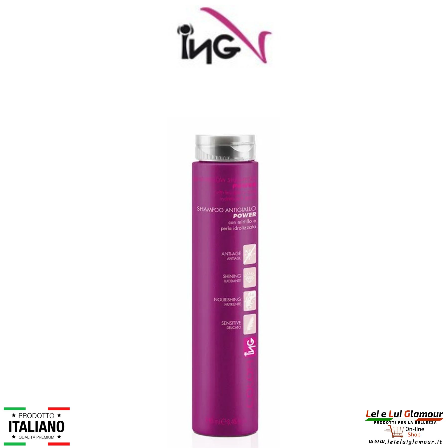 Shampoo Antigiallo Power a pH acido, per una Luminositร Professionale per Capelli Bianchi e Decolorati.