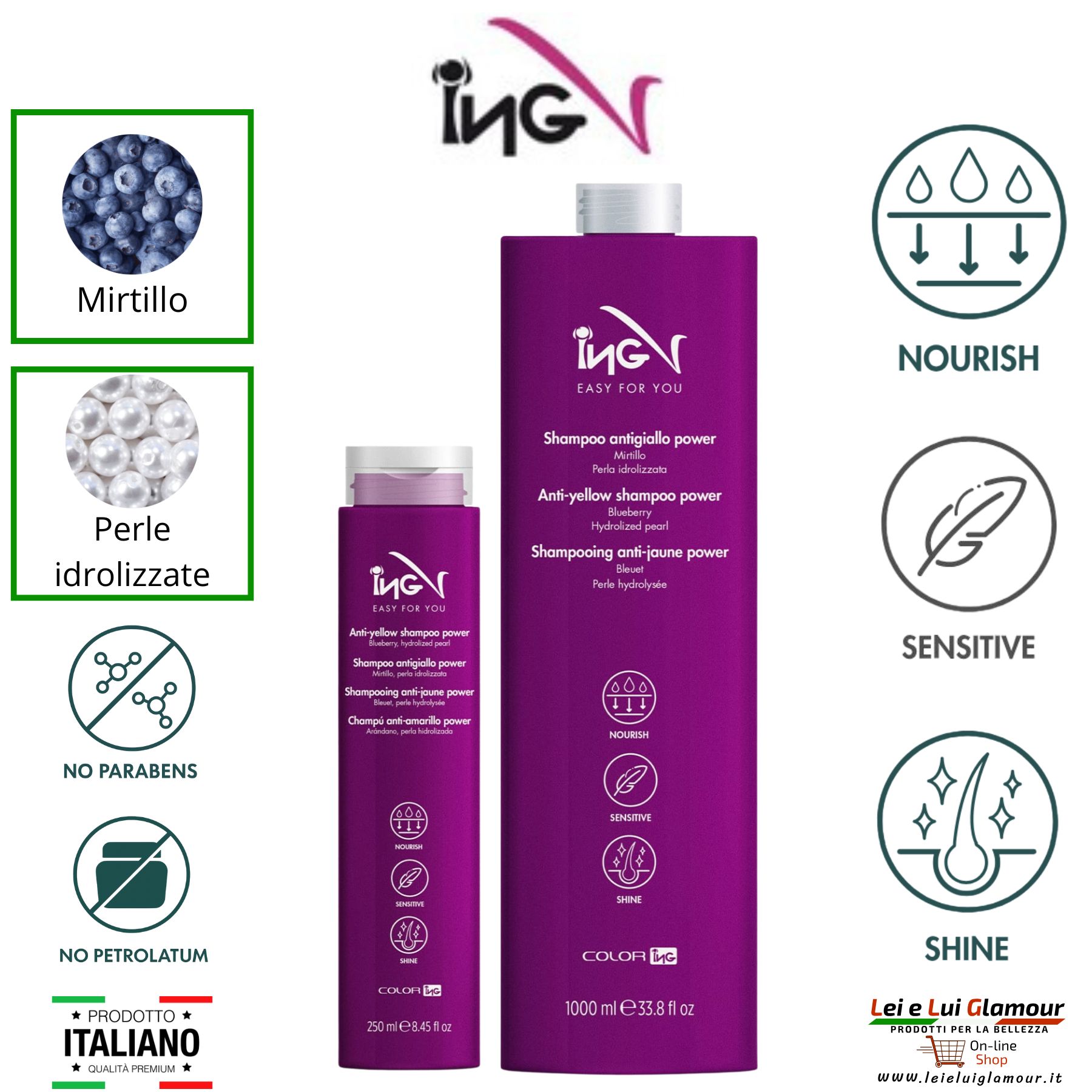 Lo Shampoo Antigiallo Power รจ un detergente professionale a pH acido, progettato per neutralizzare efficacemente i riflessi gialli indesiderati su capelli bianchi, grigi e decolorati. La sua formula evoluta, delicata ma altamente performante, valorizza la fibra capillare donando vitalitร , luce e una riflessatura piรน pura e stabile. Ideale per chi desidera mantenere un colore brillante e uniforme nel tempo, deterge con delicatezza lasciando i capelli morbidi, nutriti e visibilmente piรน luminosi. La sua forza sono i principi attivi che lo compongono: Mirtillo, ricco di antiossidanti, che aiuta a proteggere il capello dallโossidazione e a prevenire lโingiallimento e Perla idrolizzata che migliora la riflessatura, rendendo i capelli piรน lucenti e dallโaspetto sano.